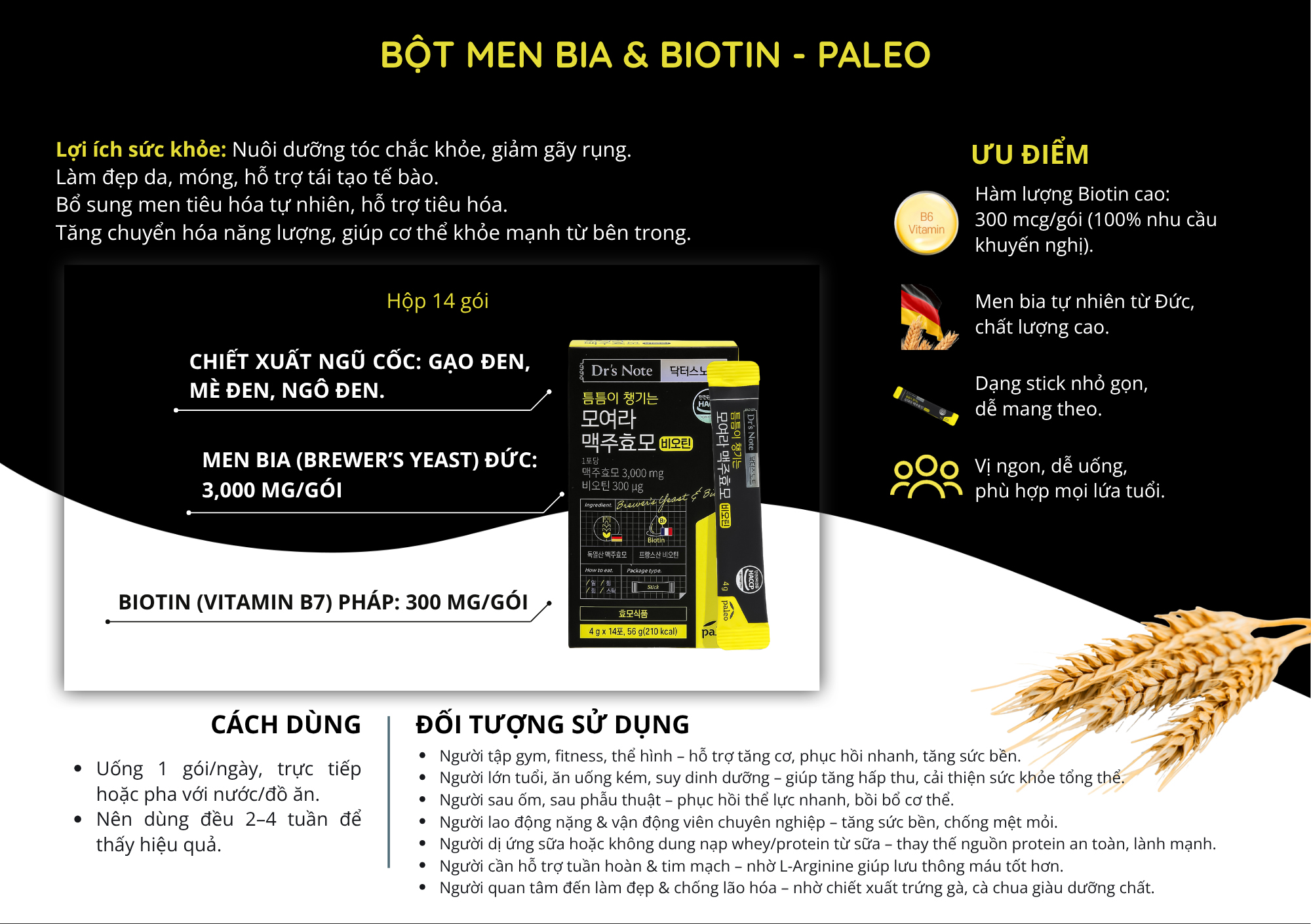 | Men bia tự nhiên (Brewer’s Yeast – Đức) | 3.000 mg – Cung cấp enzyme và vitamin nhóm B, hỗ trợ tiêu hóa, cân bằng hệ vi sinh. |