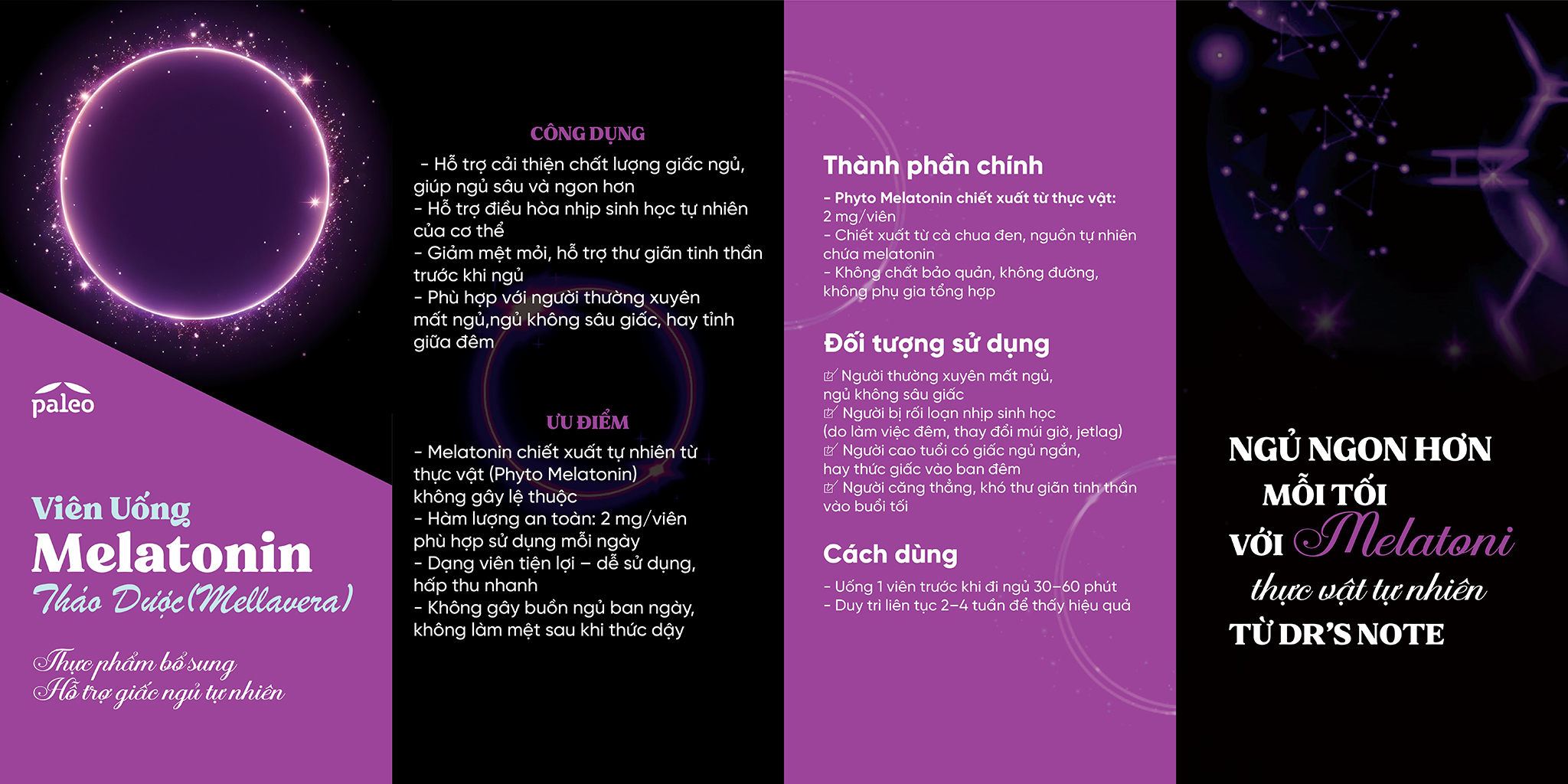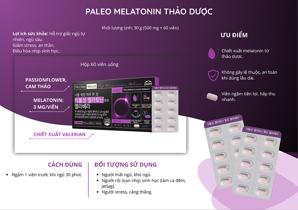 Viên Uống Melatonin Thảo Dược Mellavera từ thương hiệu Paleo (Hàn Quốc) là giải pháp tự nhiên giúp cải thiện chất lượng giấc ngủ, hỗ trợ cơ thể ngủ sâu – ngủ ngon – tỉnh dậy khoan khoái mà không gây lệ thuộc.